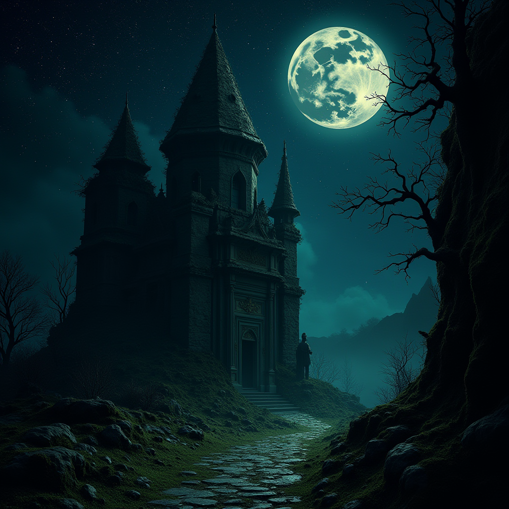 “创建一个黑暗而富有氛围的场景,展现一片广阔的星空,星空中布满奇异的星座。在前景中,描绘一座古老的、崩溃的石庙,被扭曲的藤蔓和苔藓覆盖。月光投下的阴影揭示出一些令人不安的生物在附近潜伏。整体氛围应唤起一种恐惧和未知的感觉,令人想起洛夫克拉夫特的宇宙恐怖主题