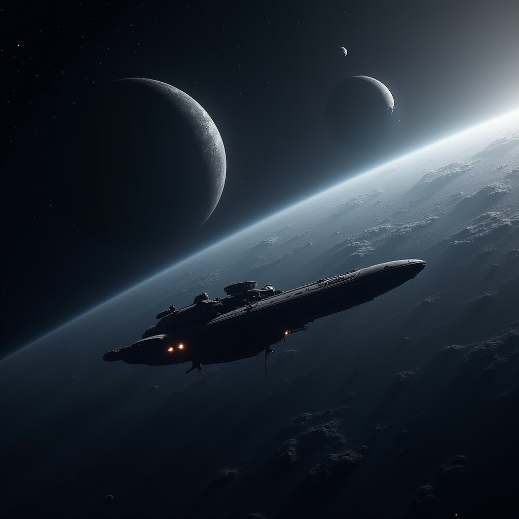 In the depths of space, with small planets in the background, a spacecraft is at the center of the scene.