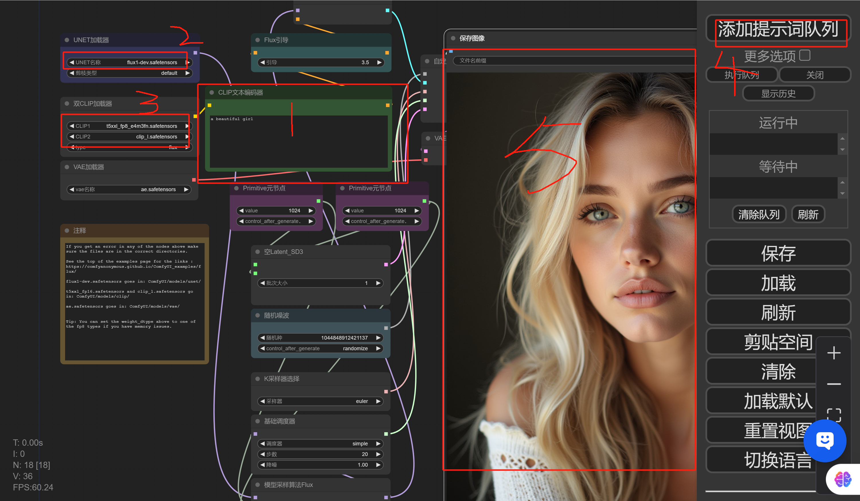 4) 选择添加提示词队列,根据设备显卡不同,等待即可在图像区进行图像生成