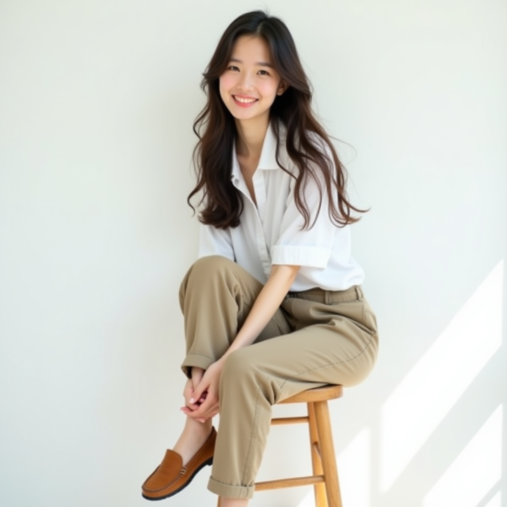 一个女孩,长发,模特,白色背景,白色衬衫,卡其色七分裤,卡其色乐福鞋,坐在凳子上,懒散的姿势,稍微歪着头,微笑,亚洲美女,宽松的衣服,双手放在身体前面,脚稍微抬起,半身照,佳能R5相机风格,背景模糊,室内,自然光,一些阳光洒在脸上,9:16。
