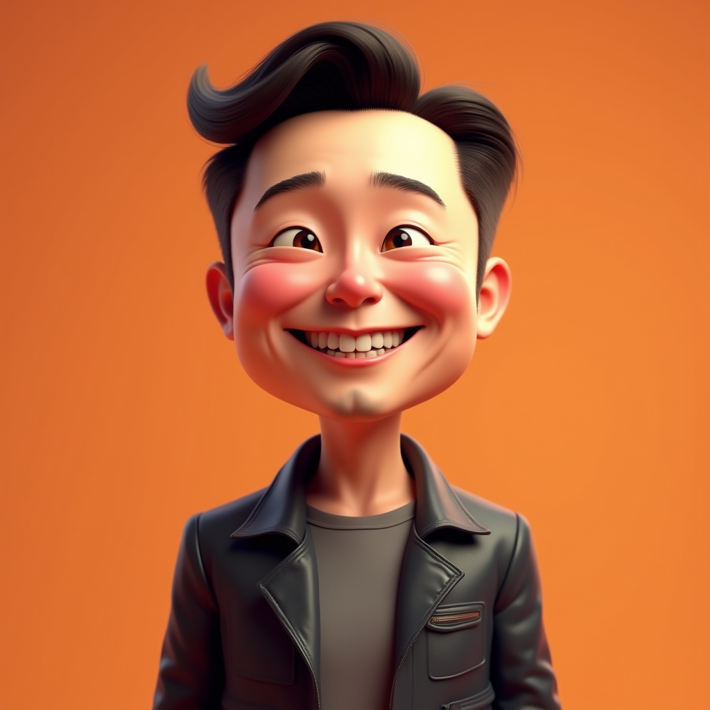 Elon Musk, successful person, Asian, happy,solid color background, C4D rendering, Pixar,9:16.
