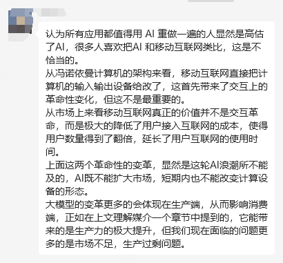 “AI既不能扩大市场,短期内也不改变计算设备的形态,目前AI浪潮不及移动互联网"这个观点,我也有一些异议。能不能和移动互联网相比,这个谁也不敢说,也不确定,但是AI产生的影响确实意义深远。