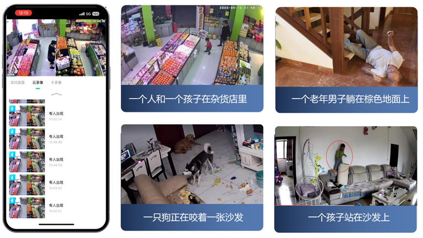 通过在端侧进行初步检测,然后在云端进行进一步的验证,我们在实时性和精度之间的做到了很好的平衡。比如我们可以在端侧进行最基础的移动侦测检测,降低数据量,再通过云端算法对场景进行识别,进行车辆、火焰、人员、动物的检测。为了进一步提升算法的可用性,可以结合视觉大模型的泛化能力,将未标记的的数据进行识别标记。不同于传统的定制开发,我们为企业提供了一站式的选择,无需从头开始,便可获得适应其需求的AI算法。