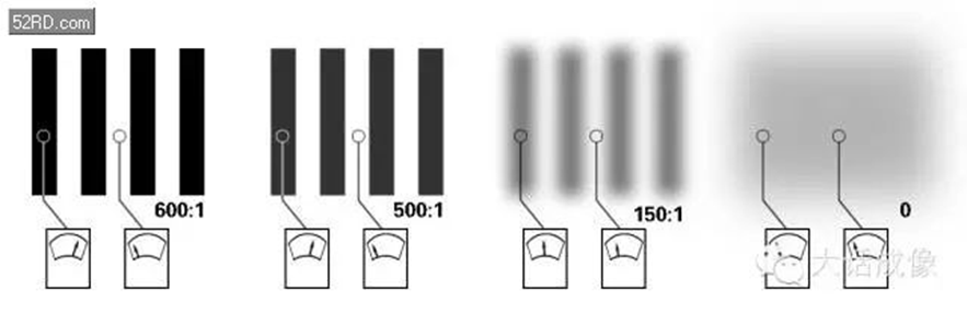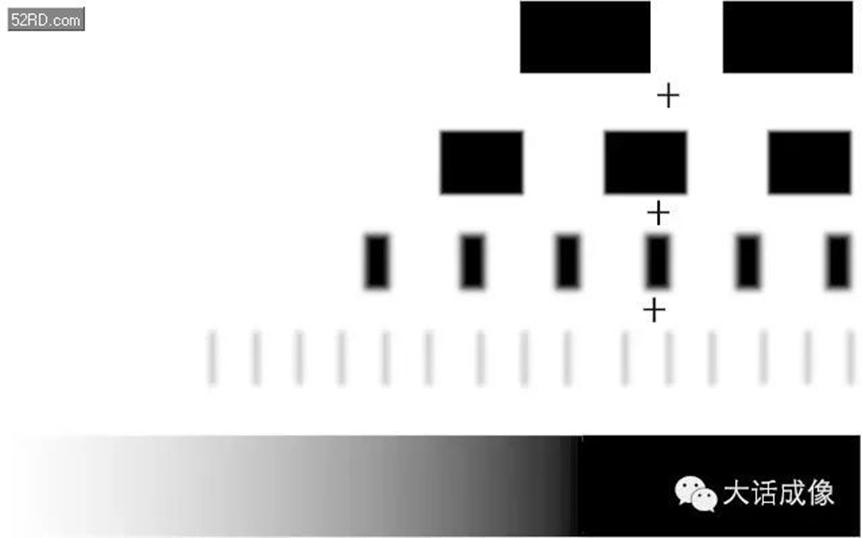 实际拍摄得到的图像,就如下图一样频率越高(越细)的线对就越模糊。但是越好的成像系统得到的线对就越清晰。
