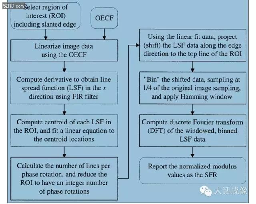 SFR是怎么测试和计算的呢。首先SFR不需要拍摄不同的空间频率下的线对。它只需要一个黑白的斜边(刀口)即可换算出约略相等于所有空间频率下的MTF 。如何通过一个斜边计算出MTF曲线建议大家可以去看下ISO12233-2000那篇文档,里面说的很详细。其具体的流程如下图。这里主要说下为什么一个斜边能够计算出本来需要大量拍摄和计算工作的才能得出的曲线