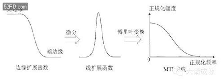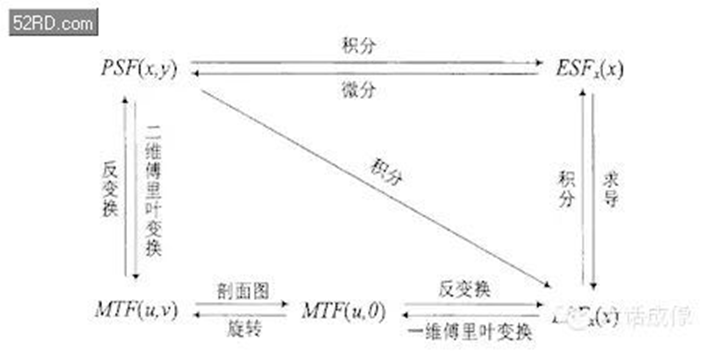 PSF,ESF,LSF和 MTF这几者之间的关系如下图。因此我们就可以知道SFR的测试实际上就是通过斜边得到ESF后计算 MTF的一个过程。因此从根本上SFR和MTF是一回事。