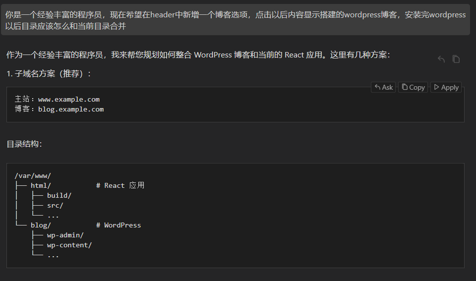 作为一个半点js不会的产品经理,我理所当然的咨询了cursor,提示我用子域名或者子目录的方式来进行合并,考虑到如果是子目录的方式,我本地如果要做调试需要和云端保持一致非常困难,于是选用子域名的方式