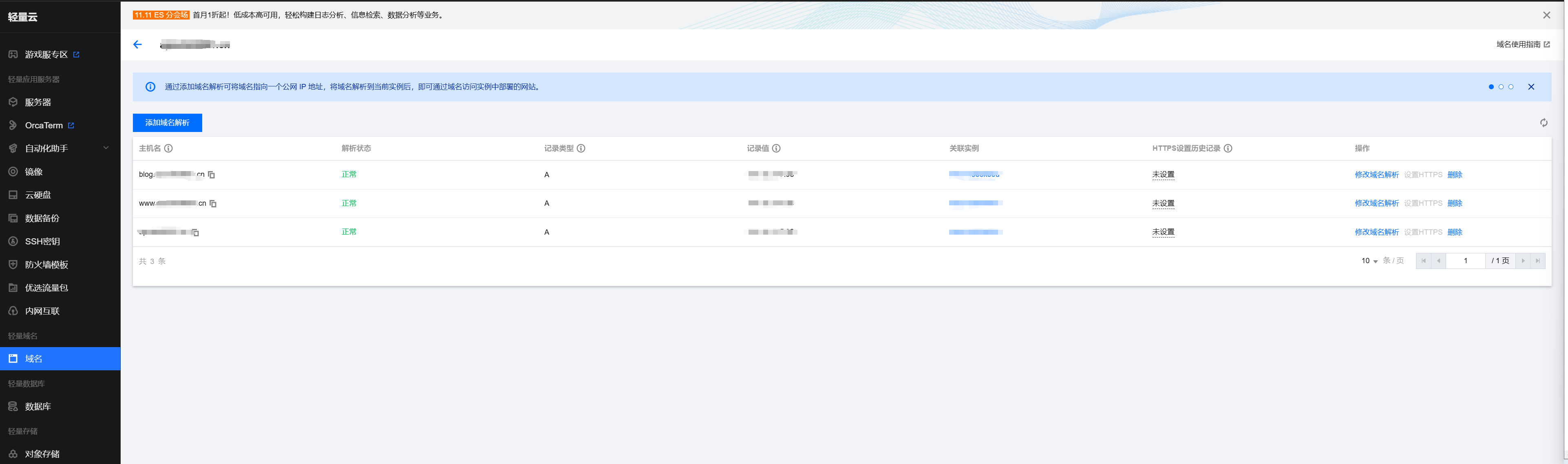 选择对应购买的服务器,进入域名管理控制台,点击对应的域名,并添加对应的域名解析,域名解析是blog.yourdomain.cn。