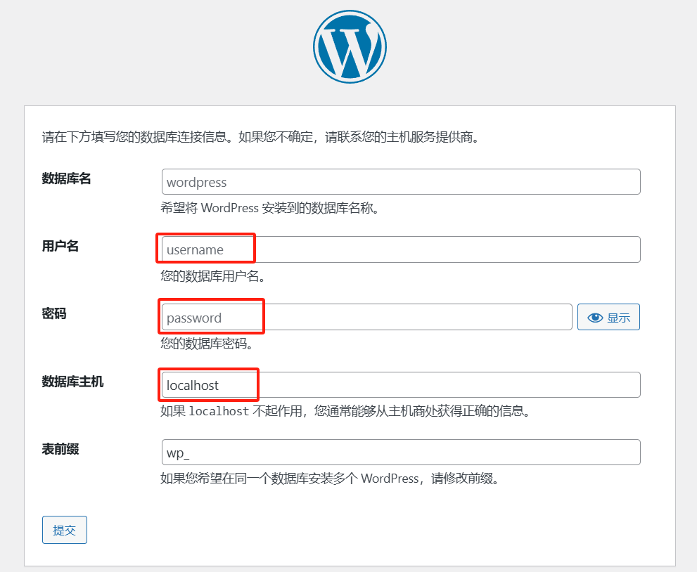 请注意用户名和密码是用于wordpress登录使用,本案例是用的用户名是wordpressadmin和admin123,请自行新建用户名和密码