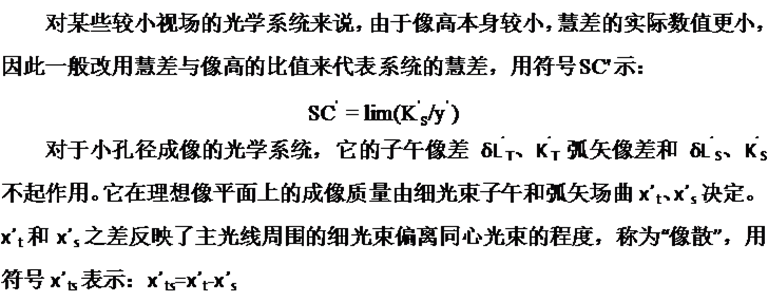 与子午光线对的情形相对应,我们用弧矢光线对的交点离理想像平面的轴向距离表示此光线对与理想像平面的偏离程度,称为弧矢场曲。光线对交点离开主光线的垂直距离表示此光线对交点偏离主光线的程度,称为弧矢慧差。当光线对称地逐渐向主光线靠近,宽度趋于零时,它们的交点趋近于一点,这一点应该位于主光线上,它离开理想像平面的距离称为细光束弧矢场曲。不同宽度弧矢光线对的弧矢场曲和细光束弧矢场曲之差,代表了细光束和宽光束交点前后位置的差,可称为轴外弧矢球差。